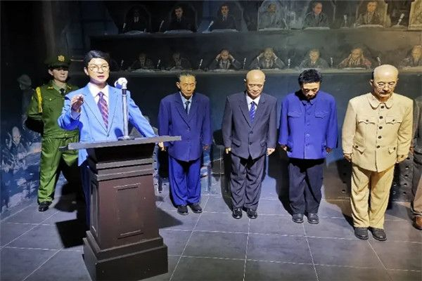 众多历史陈设中,复原后的审判大厅给团队成员留下了深刻印象。复原后的审判大厅按照一比一的比例,通过雕塑群真实地再现了当年审判现场的场景。主席台上审判长高声朗读宣判书,台下证人席、鉴定席、检察员、翻译、记录员、书记员、辩护席等工作人员昂首站立,而受审的36名日本战犯低头认罪状,听着正义的中国人民对他们在战争中所犯下的罪行进行审判。