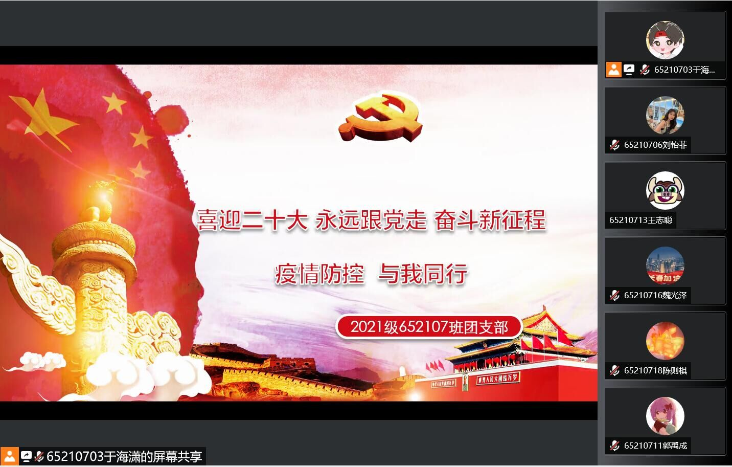 为响应全面贯彻党的十九大和十九届历次全会精神,深入学习习近平总书记关于青年工作的重要思想,w88优德652107团支部于2022年4月13日10:00,线上开展了以《喜迎二十大、永远跟党走、奋斗新征程》为主题的团日活动。本次活动由团支部书记于海潇主持,支部全体同学参与了本次活动。