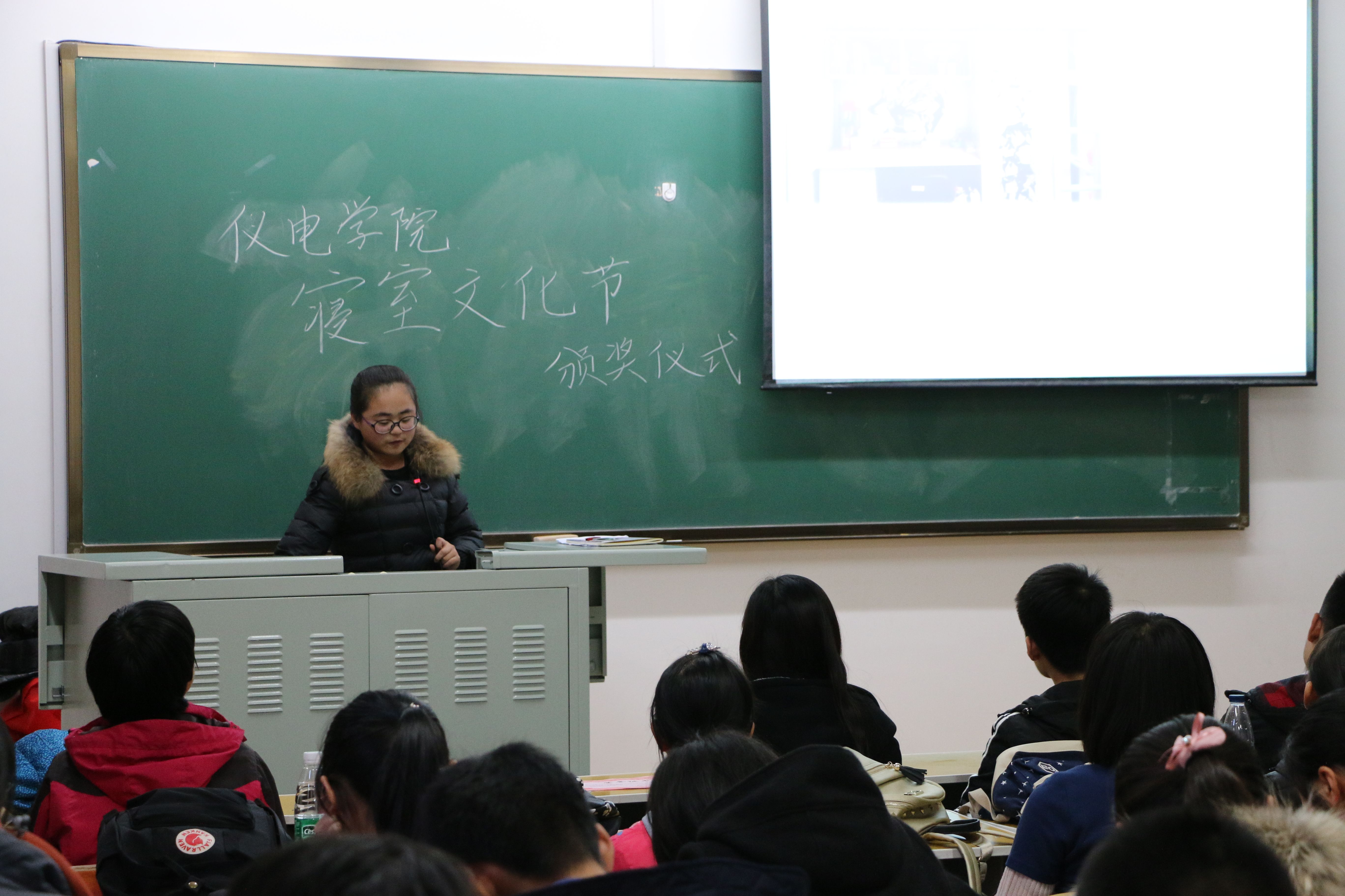 10月29日13:30,颁奖典礼于李四光楼313开始,16级新生就坐完毕,主持人齐吉政上台,全场掌声雷动。首先,主持人对大家的到场表示衷心感谢,在大屏幕上展示了各优秀寝室照片,并介绍了获三等奖的寝室。之后的典礼中,各候选寝室将分别到台前进行介绍,并由在场观众从候选的男女各三个寝室中选出冠军。