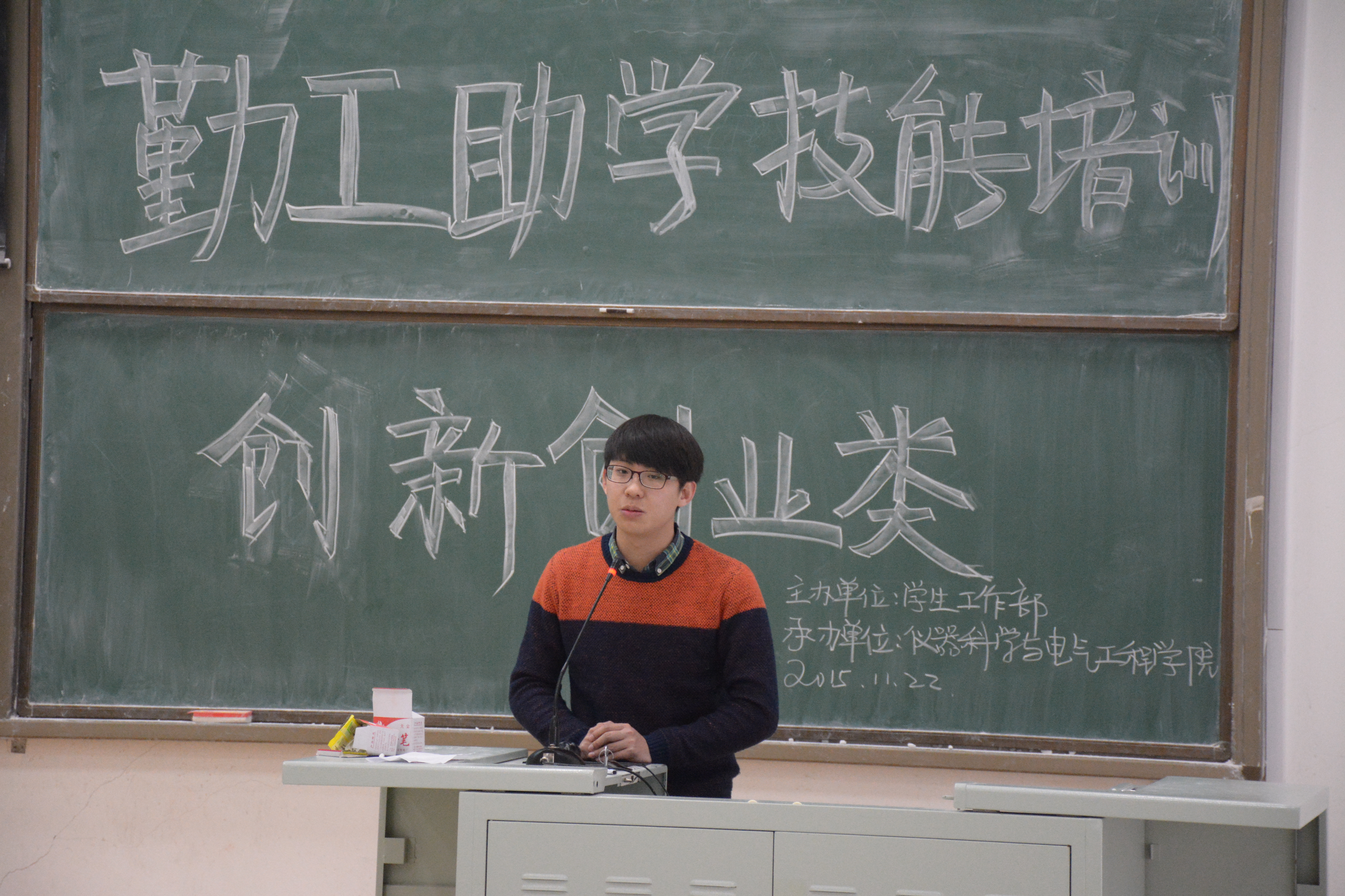 为进一步增强勤工助学员工的实践技能,激发员工创新创业热情,具备基本的电子技能,更好的满足勤工助学单位需求,员工工作部和勤工助学中心对公司从事勤工助学工作或有勤工助学需求的员工开展综合技能培训项目。w88优德电子科技协会于2015年11月22日在中心校区李四光楼第二阶梯教室成功承办勤工助学创新创业类综合技能培训项目“双创—创新创业”专题讲座。讲座由w88优德电子科技协会主席穆怀志主持,电子科技协会前主席任同阳主讲,来自中心校区各学院从事勤工助学工作或有勤工助学需求的员工参加了此次讲座。