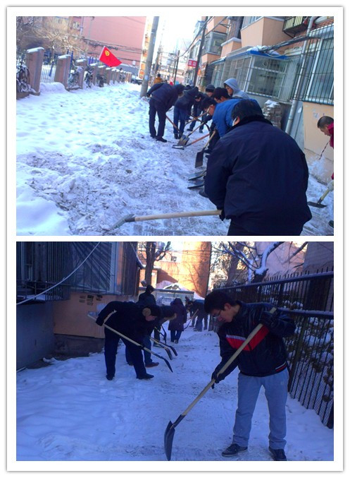 上午10时,公司2011级老员工志愿者在“牵手”青年志愿者协会负责人的带领下来到了南昌社区。志愿者们不辞辛苦,自带扫雪工具。刚刚到达南昌社区立即开始扫雪活动,南昌社区负责人曲书记十分感谢大家能够利用有限的课余时间、不畏寒冷地坚持为居民清理道路积雪。志愿者们在凛冽的寒风中努力的工作着,手、脚冻得有些麻木也未停歇,在志愿者们的辛苦努力下,社区三条通道很快清扫干净。当社区居民发现路面行走起来如此方便安全时,十分开心,不断向志愿者们表示感谢,还热情地邀请志愿者们去家里取暖。扫雪任务结束后,志愿者们在工作人员带来下来到南昌社区会议室,南昌社区党支部曲书记为大家讲解了由社区八旬老人为纪念毛主席而作的诗词事迹展板,并鼓励青年员工应该多多关注历史文化,学习革命前辈的先进事迹与宝贵精神,不断进取,努力奋斗成为国家的栋梁之才。
