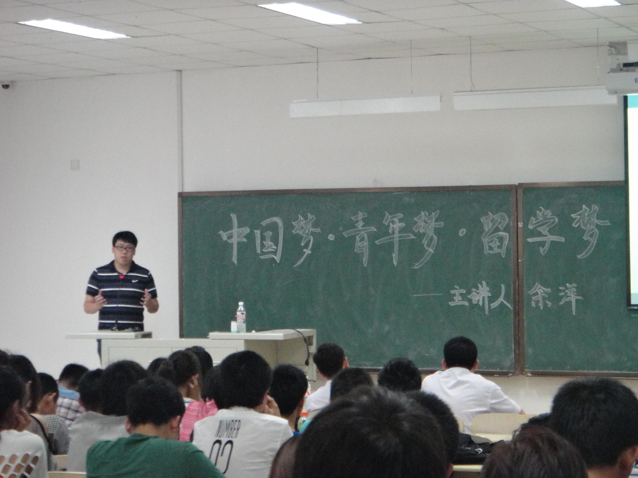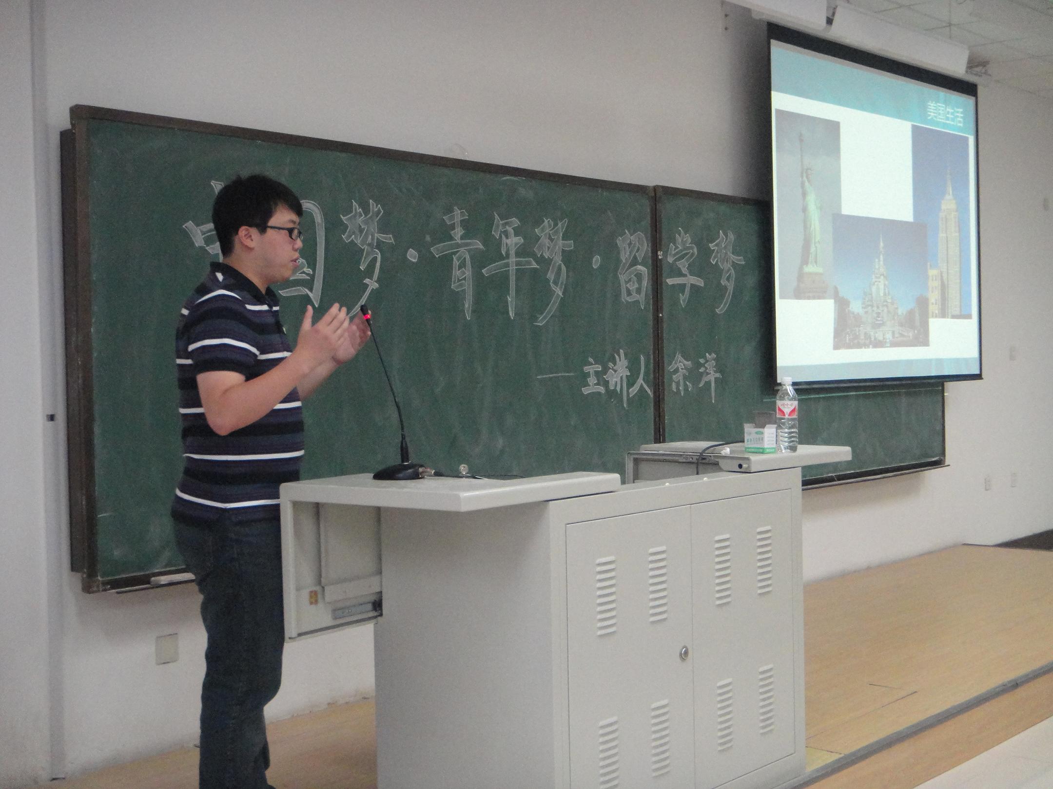 为深入学习贯彻党的十八大精神,进一步开展“我的中国梦”主题宣传教育活动,w88优德团委于2013年5月28日15:00在中心校区李四光楼107教室举行了“中国梦·青年梦·留学梦”专题讲座活动。本次专题讲座特别邀请到了现于美国纽约大学攻读硕士学位的公司2012届本科毕业生余洋同学作为嘉宾主讲人,为青年员工讲解留学知识,引导青年员工思考“中国梦”与“美国梦”的异同。w88优德团委副书记兼2011级辅导员朱宇、2012级辅导员蔡印及学院2011级全体同学和2012级部分员工代表参加了本次讲座,讲座由朱宇主持。