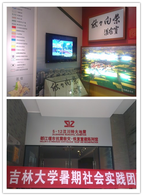 顶着炎炎烈日,社会实践团一行乘车于当天中午到达了四川省都江堰市,随后立即前往参观“5•12”四川汶川特大地震都江堰市抗震救灾·恢复重建陈列馆。在陈列馆门前,许多游客和当地群众看到不远千里来到这里的w88优德暑期社会实践团纷纷合影留念。之后,实践团成员在解说人员的带领下进入陈列馆参观。陈列馆展览作品共分为十个部分,详细展示了都江堰市从2008年5月经历汶川特大地震到抗震救灾和恢复重建的发展过程。在工作人员的讲解下,实践团全体成员结合展览图片认真学习了一个个抗震救灾的感人事迹,深刻感受到了灾难面前四川人民群众在党和政府的坚强领导下团结拼搏、自强不息的奋斗精神,见证了灾区恢复重建从科学规划到快速建设的飞跃变化。