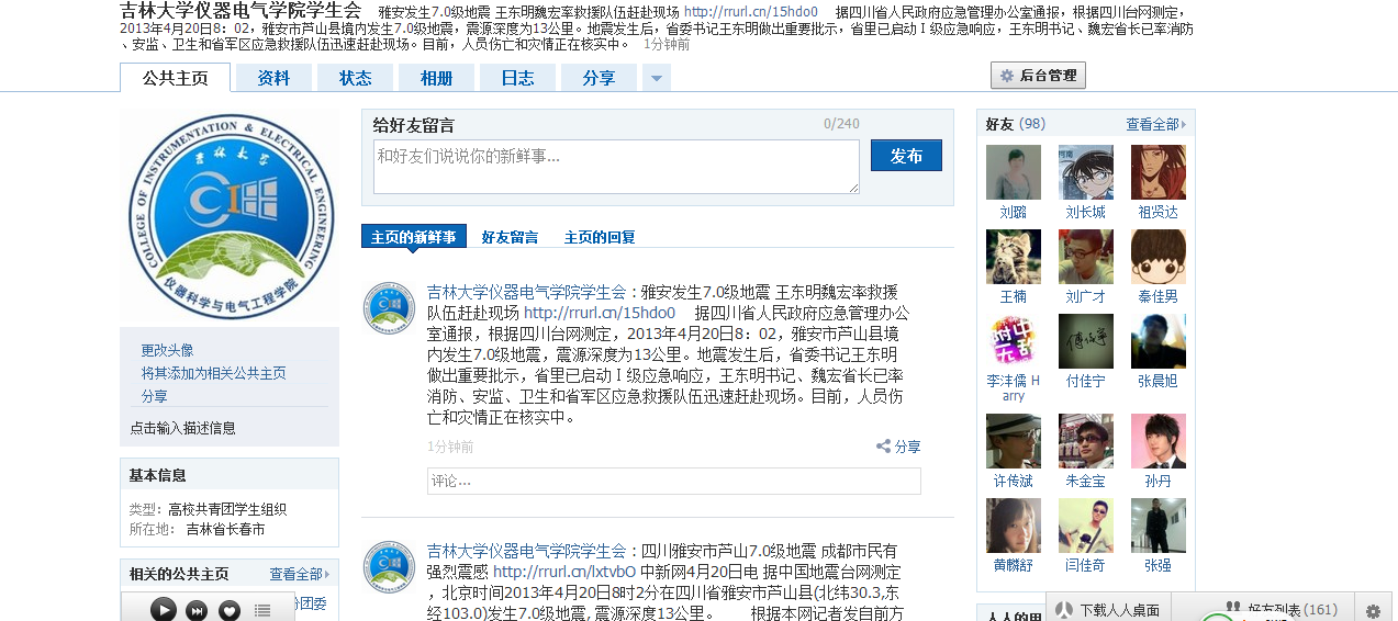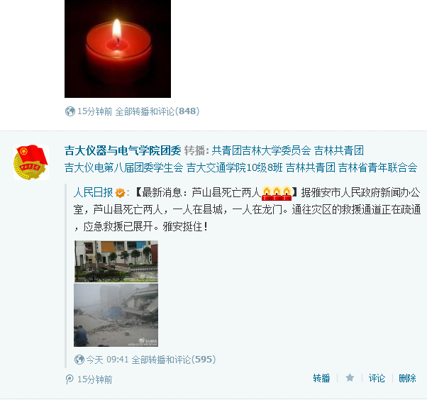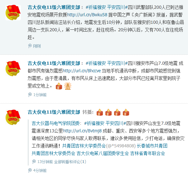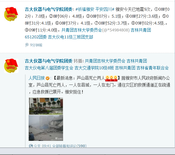2013年4月20日上午8点左右四川省雅安市芦山县发生7.0级地震, 震源深度13公里,成都、重庆、西安、贵阳等地都有不同程度震感,芦山老县城一大批旧瓦房几乎全部倒塌,截止该日上午11:30已有30人遇难,四川省地震局初步统计伤亡人数将上百人。灾情牵动着全国人民的心,也牵动着青年员工的心。在获知地震灾情后,w88优德团委运用微博、人人网等新媒体工具第一时间向学院青年师生发布灾区信息,各班级团支部利用微博等关注灾情,广大青年员工在网络上第一时间向四川雅安地震灾区传递祝福。