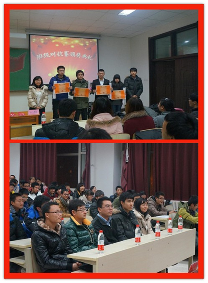 活动首先播放了此次班级对抗赛活动集锦视频短片,让同学们回顾了对抗赛的一个个精彩瞬间。随后,对抗赛中具体承办和组织各项活动的各部门代表进行了发言,他们简要回顾了活动的过程,充分肯定了同学们的努力,同时也对所有活动组织者的辛勤劳动表示衷心感谢。接下来是激动人心的颁奖环节,首先由主持人宣读了对抗赛中各个项目的获奖名单,接着由各位到场嘉宾依次为获奖同学、班级颁奖,并由获奖同学代表发表获奖感言,大家的脸上都洋溢着获奖后的喜悦。最后,2012级辅导员蔡印老师和院团委副书记朱宇老师分别进行了总结讲话。他们对同学们积极的表现表示了认可,对辛勤组织活动的各部门成员表示了肯定,同时鼓励大家再接再厉,再创佳绩。